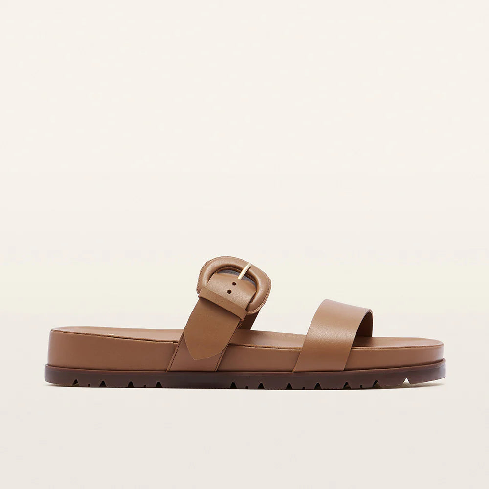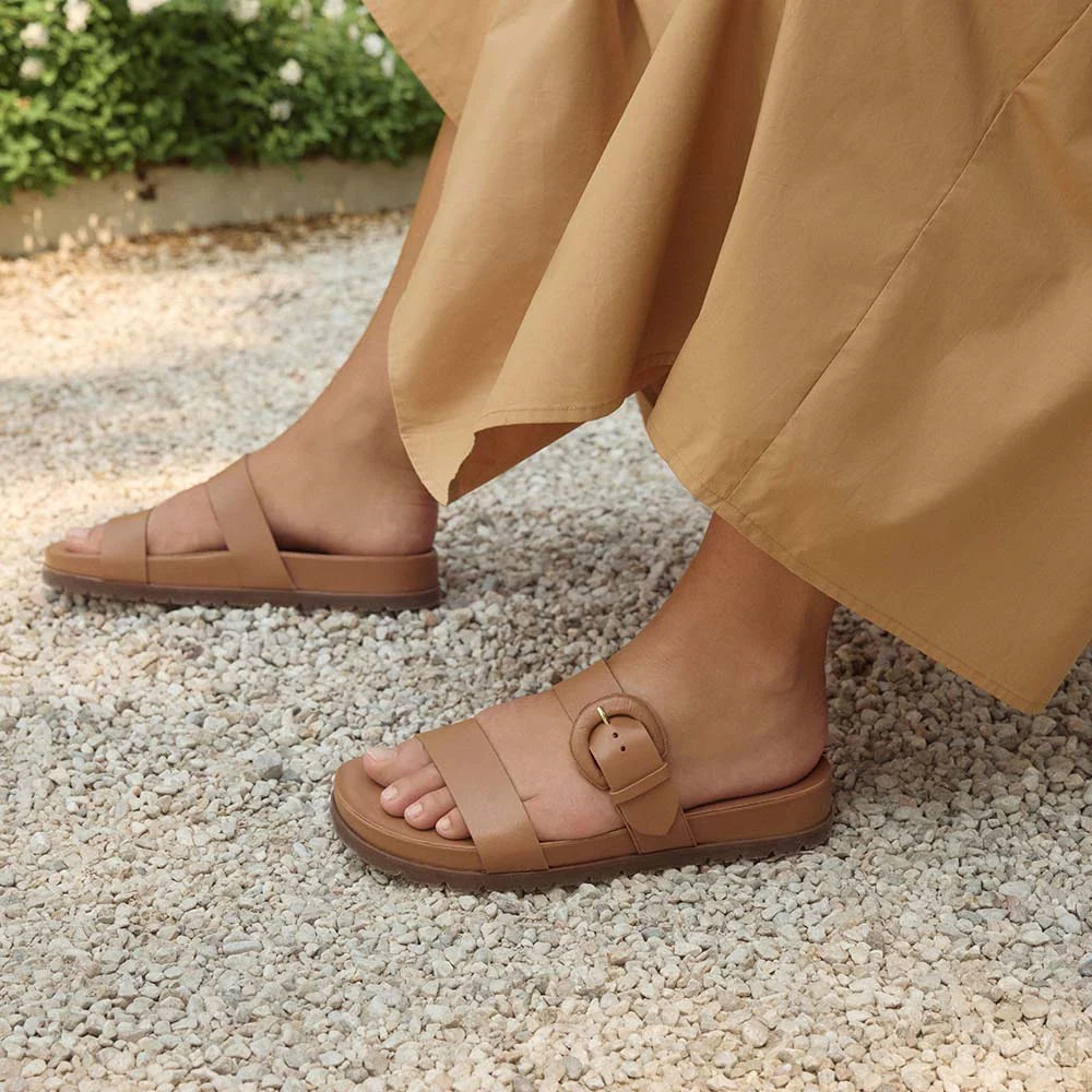 Grounded in elegance, Tyla in Tan brings polished ease to warm-weather dressing. With a standout buckle on an adjustable upper strap and a sleek two-strap design, this slide offers elevated versatility. Underfoot, our Sole Hero® Footbed cushions and supports, while the traction-forward sole with excellent flex through the forefoot enhances movement and helps make every step feel more secure. A classic tan slide that adds interest to off-duty outfits, office days, and everywhere in between.