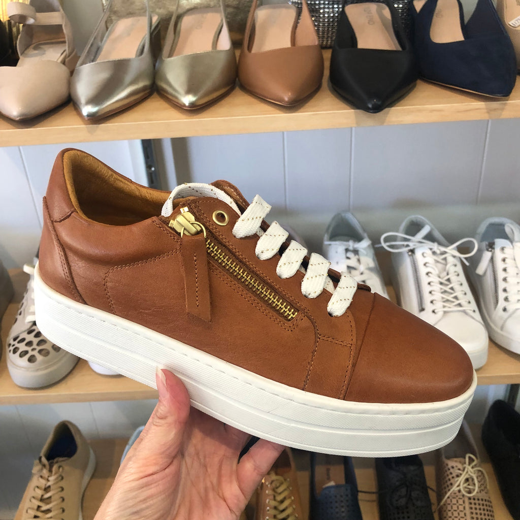 The Sala Abbey Tan Coconut Sneaker combines European craftsmanship with everyday comfort. Crafted from supple tan leather, this versatile sneaker features a distinctive dual-access design—zippered closure paired with traditional lacing for customizable fit and convenience. The crisp white flatform sole provides a modern silhouette while delivering reliable support for all-day wear. A refined choice for those who appreciate quality construction and thoughtful design details.