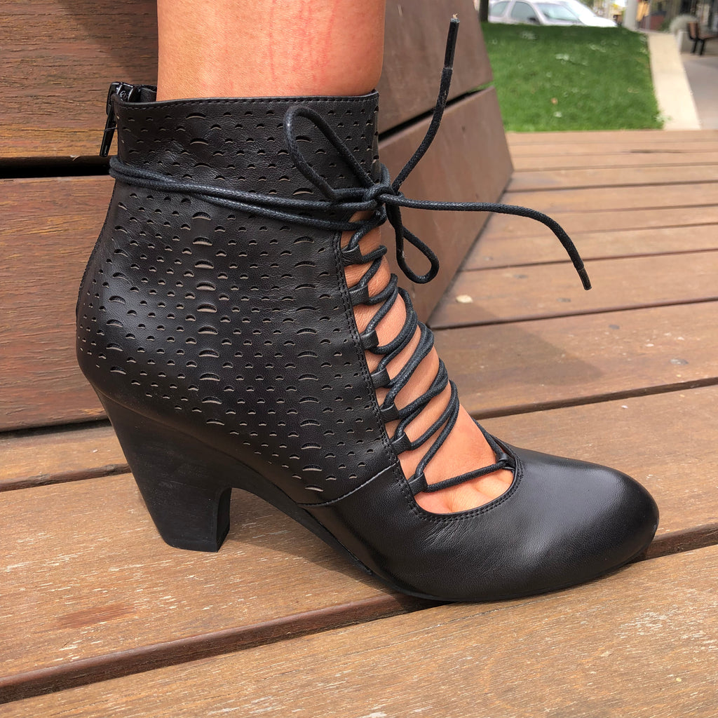 A cheeky cut leather heeled lace up with the beauty of keeping your toes away.