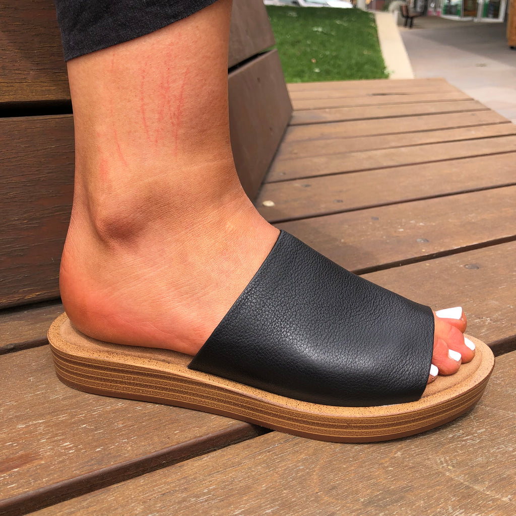 Simply slip this shoe on and you're ready to go! A classic leather slide with a snug padded footbed, this design offers chic minimalism with a comfy twist. Whether you're off to the beach or shopping in the city, you can do it with style in FARON.